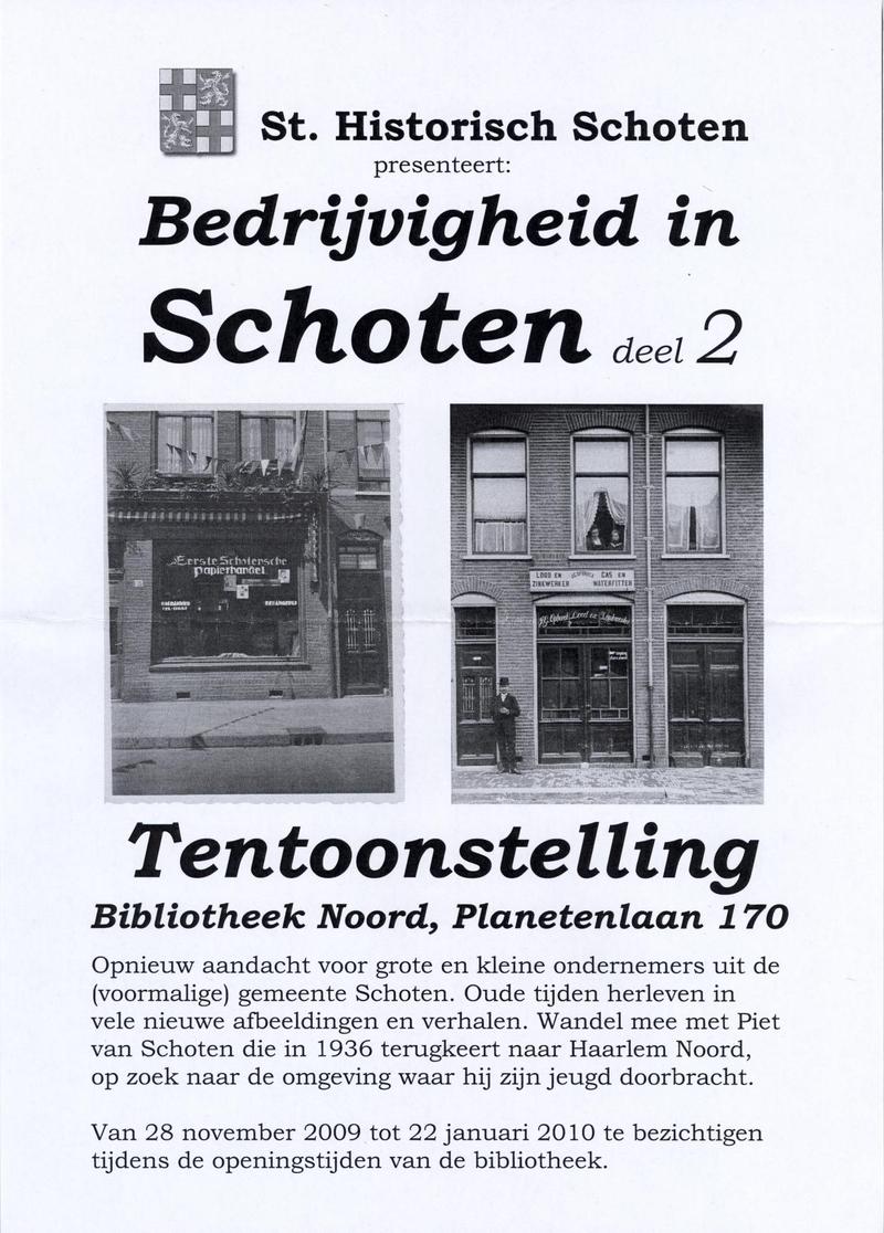 Op 28 november 2009 heeft Burgemeester Mr. Bernt (B.B.) Schneiders het vervolg van de Tentoonstelling Bedrijvigheid in Schoten (deel 2) in de bibliotheek van Haarlem Noord geopend. Na het officiele gedeelte bekeek hij met een aantal belangstellenden de met zorg gemaakte tentoonstelling. Veel nieuwe “oude” feiten en foto’s worden getoond. Hieruit blijkt dat de geschiedenis van Oud-Schoten zich mag verheugen in een grote belangstelling. Een bezoek aan deze Tentoonstelling is zeer de moeite waardt. De tentoon-stelling is te bezichtigen tot 22 januari 2010.