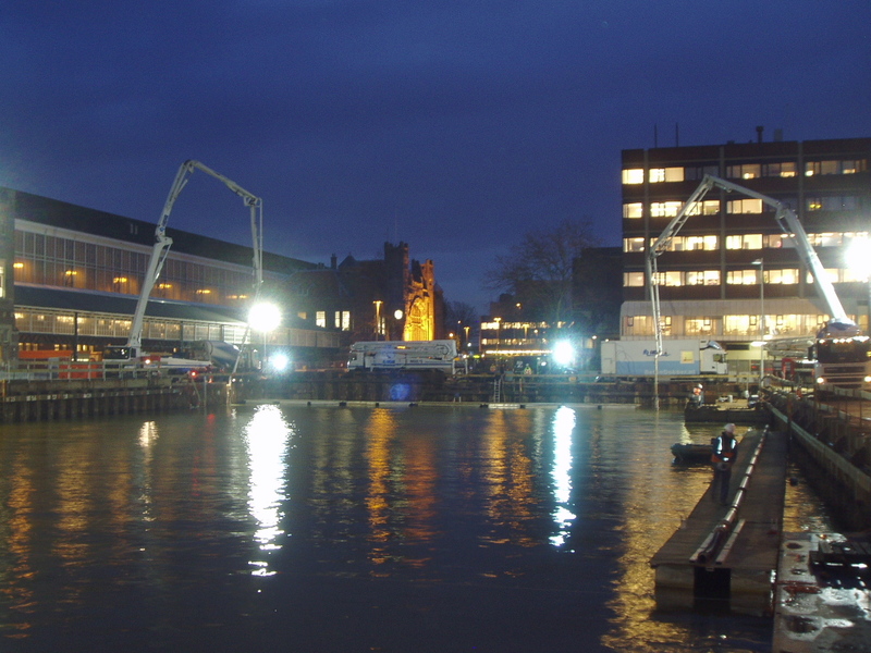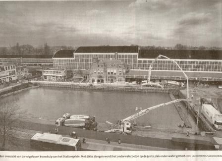 Op het grote plein voor het Station van Haarlem is begonnen met het storten van een dikke betonlaag op de bodem van de bouwput, die momenteel geheel onder water staat. Het werk gaat dag en nacht door. Hier een sfeervolle avondimpressie en een mooie overzichtsfoto uit het Haarlems Dagblad van 1 december 2009.