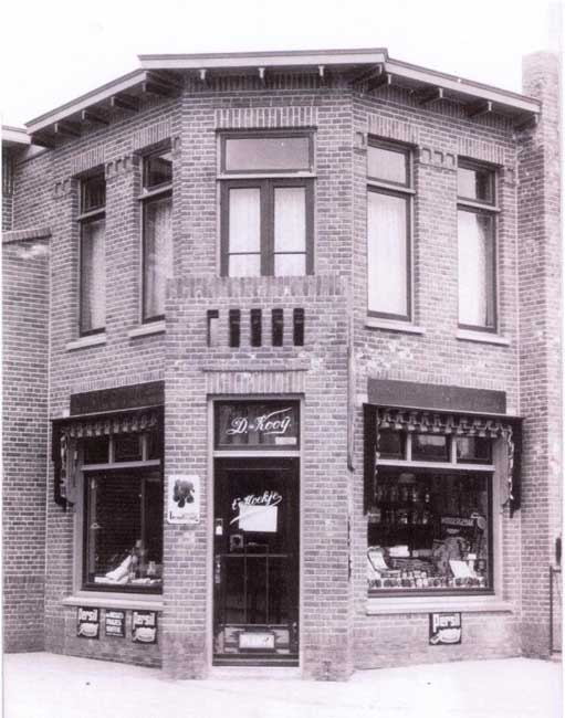 Hier een foto van de winkel (’t Hoekje”) van D. Kooij, Overtonweg 3 in Haarlem Noord. De foto dateert uit de tijd rond 1926. Ernaast een foto uit 2009 van hetzelfde pand. Het pand heeft inmiddels geen winkelfunctie meer.