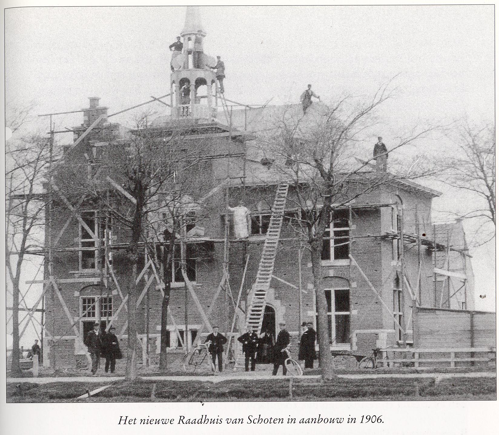 In 1906 werd een aanvang gemaakt met de bouw van het raadhuis in Schoten. Het oude raadhuis aan de Vergierdeweg 52 werd (door de uitbreiding van het Schoterkwartier) te klein. Bovendien verkeerde het in slechte staat van onderhoud. Aan de bouw van het nieuwe raadhuis ging een discussie vooraf, op welke pek het zou moeten verrijzen, In Schoten, het Schoterkwartier, of nog zuidelijker. Uiteindelijk werd gekozen voor de plek, waar het nu nog steeds te vinden is, Rijksstraatweg 24. Het nieuwe raadhuis, met de tegenoverliggende burgemeesterswoning werd opgeleverd in 1907.Bij het raadhuis werd een aparte veldwachterswoning gebouwd. Lang heeft het gebouw niet als raadhuis gediend; na twintig jaar werd Schoten bij Haarlem ingelijfd en moest voor het gebouw een andere bestemming worden gezocht. De archieven werden overgebracht naar het stadhuis van Haarlem. Sindsdien deed het pand geruime tijd dienst als politiebureau. Later kreeg het diverse andere maatschappelijke bestemmingen. Na bijna honderd jaar was het pand aan een grondige renovatie toe. Het was vervallen, het was er vochtig en duiven hadden hun intrek genomen tussen het plafond. De renovatie werd ter hand genomen en sinds 2005 ziet het gebouw er weer mooi uit. Hieronder enkele foto’s, waaronder een van het uurwerk van de klok.