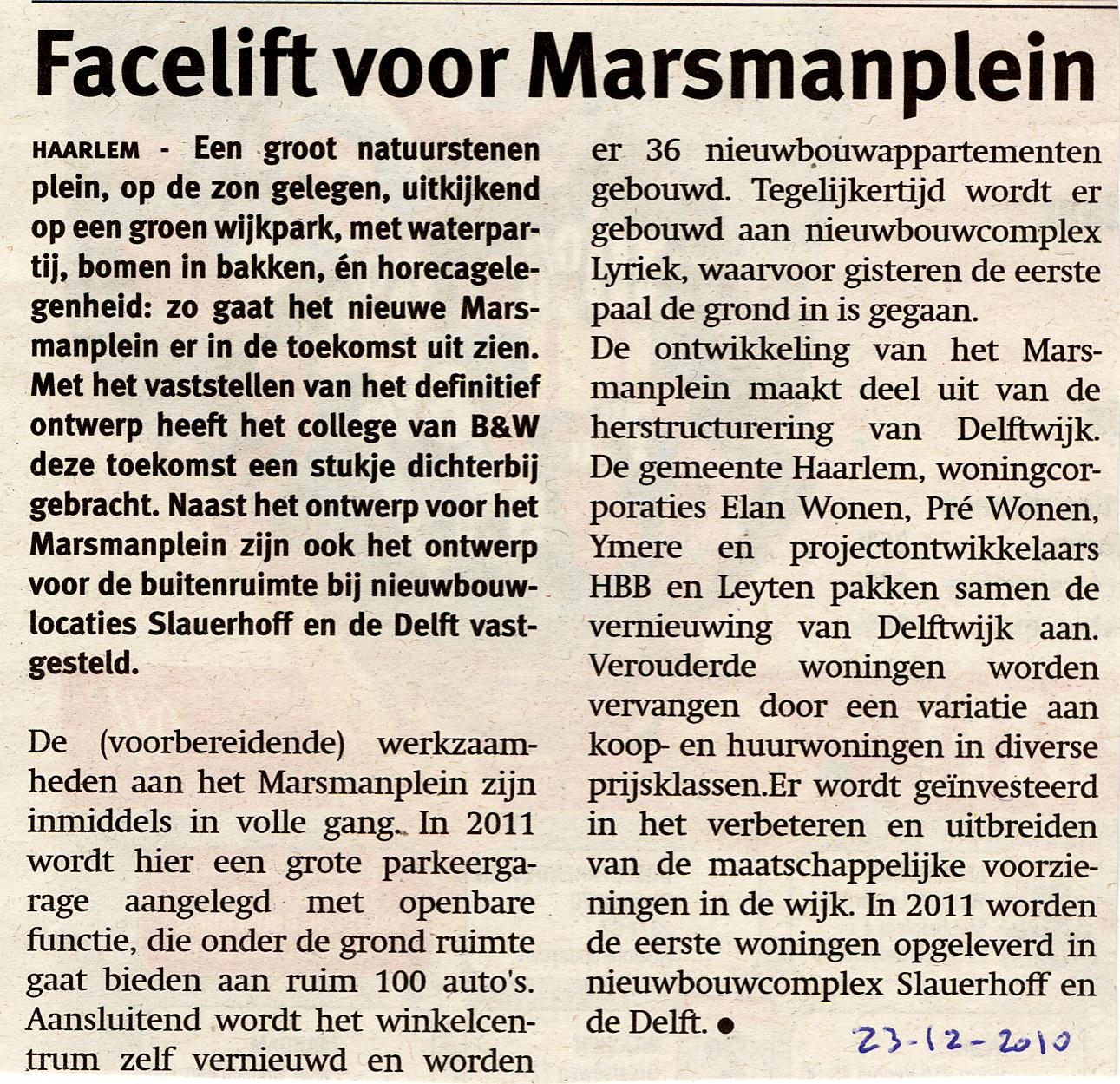Een groot natuurstenen plein, op de zon gelegen, uitkijkend op een groen wijkpark, met waterpartij, bomen in bakken en horecagelegenheid. Dat zijn de ingredienten voor het nieuwe Marsmanplein. Naast het ontwerp voor het Marsmanplein zijn ook het ontwerp voor de buitenruimte bij nieuwbouwlocaties Slauerhoff en de Delft vastgesteld. Voor meer info klik op de link hierna http://www.haarlem.nl/index.php?id=1756