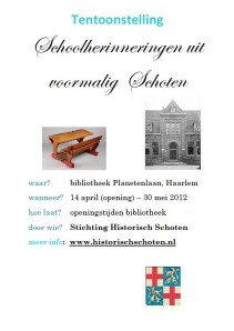Stichting Historisch Schoten heeft in de Bibliotheek aan de Planetenlaan in Haarlem-Noord een tentoonstelling ingericht over scholen in voormalig Schoten, thans Haarlem-Noord. Er zijn tal van oude school attributen te zien, en veel foto’s. Hiervoor zijn in de afgelopen periode archieven doorzocht en is er vaak uniek (foto) materiaal aangetroffen, waarmee de geschiedenis van het onderwijs in het voormalige dorp wordt gepresenteerd. Bekende scholen uit de periode tot 1940 komen aan bod, onderwijsmiddelen en ook de verzuiling die in het onderwijs een rol heeft gespeeld. De tentoonstelling is te zien t/m 30 mei 2012.