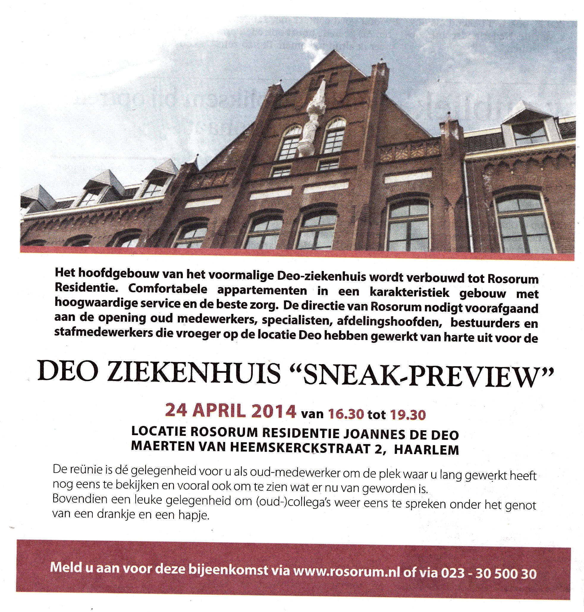 Binnekort opent het Rosorum haar deuren in het prachtig gerenoveerde pand van voormalig ziekenhuis St. Joannes de Deo. Hieronder een advertentie uit het Haarlems Dagblad, waar een bezichtiging voor oud medewerkers wordt aangekondigd. Een unieke kans om het gebouw eens te bekijken. kijk ook op http://www.rosorum.nl