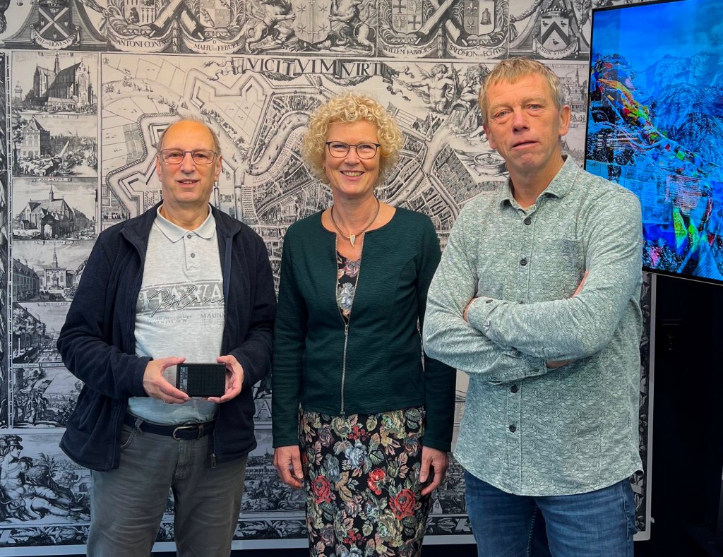 Martin Hop en Ellen Pijnakker van CopyNet overhandigden 9 november een schijf met digitale bestanden aan Ton van Beelen van Stichting Historisch Schoten.