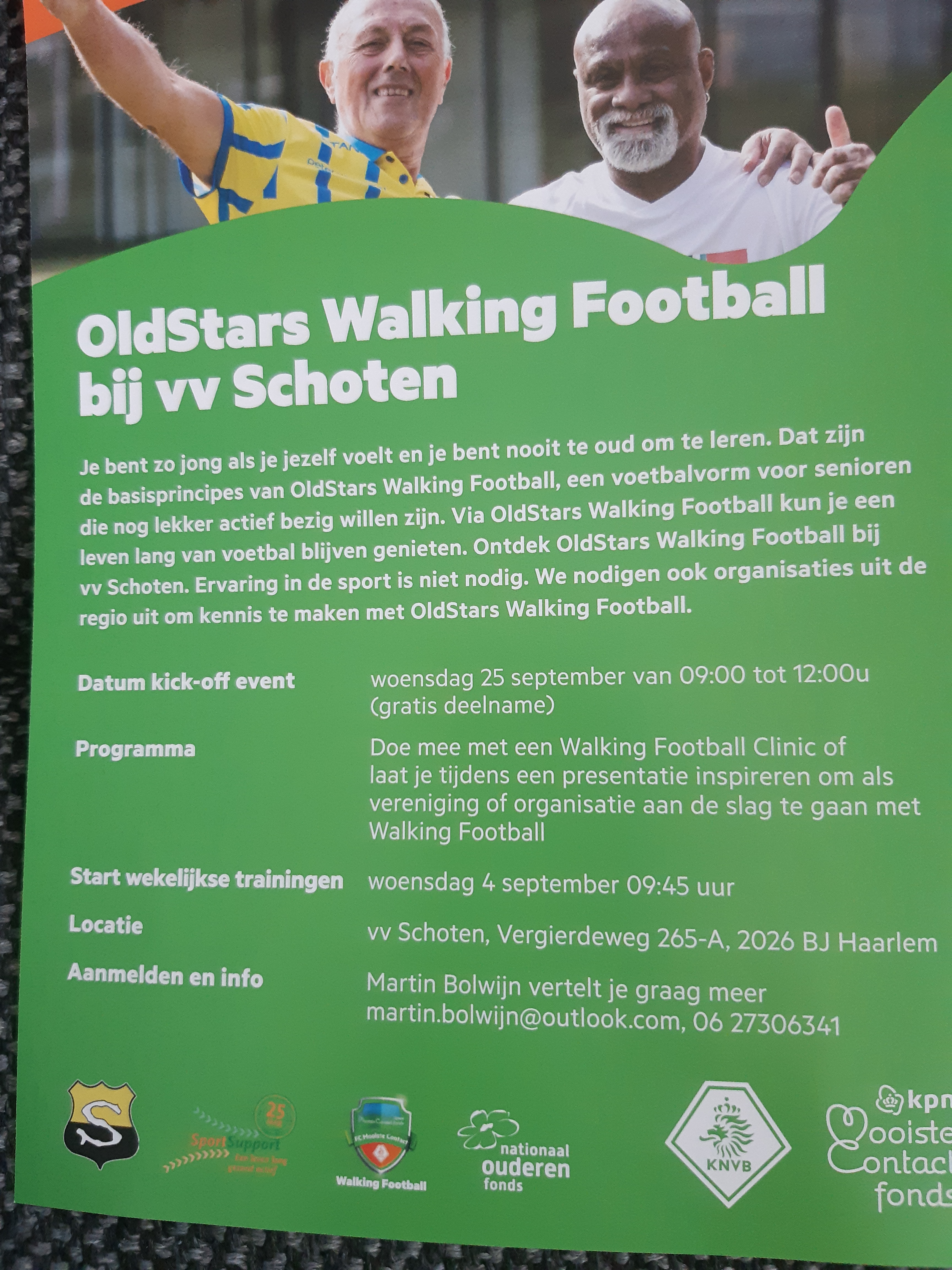 Er worden ook organisaties uit de regio uitgenodigd om kennis te komen maken met OldStars Walking Football. De datum van de kickoff is 25 september van 09.00 tot 12.00 uur bij vv Schten aan de Vergierdeweg 265A, 2026 BJ Haarlem